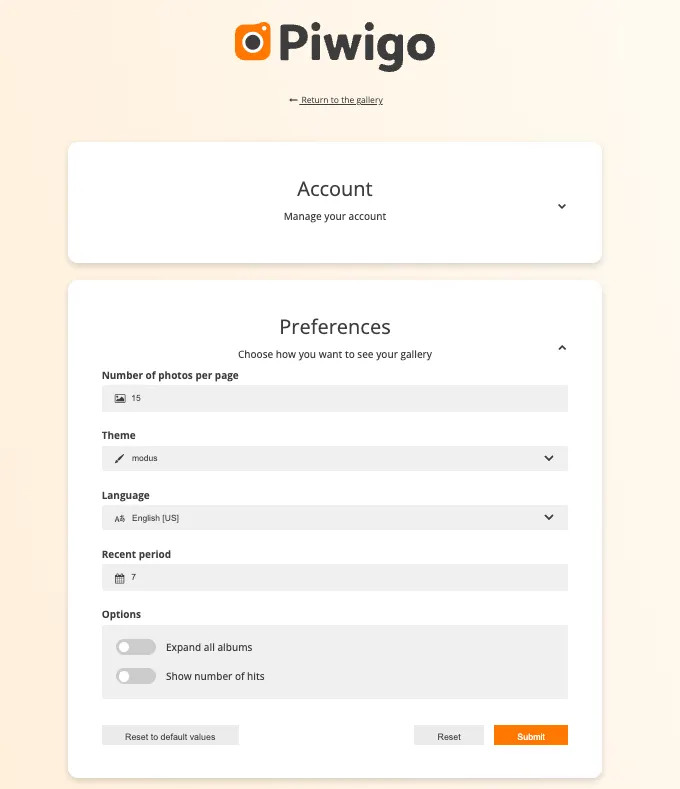 With Piwigo 16, you can enable a new option that applies a modern design to pages shared across all themes (login, profile, password recovery).