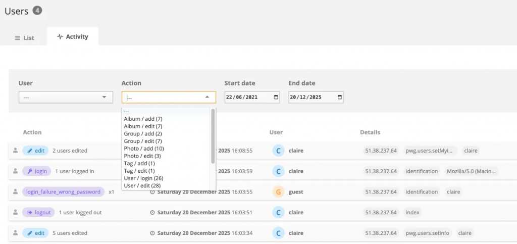 With Piwigo 16, you can now also filter activities by type—and most importantly, by date.