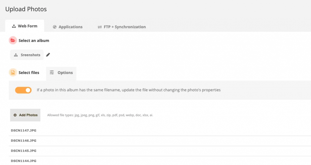 Among the uploaded photos, Piwigo will detect files in the same album with the same filename. The image itself will be updated visually, while its properties (title, tags, description, etc.) will remain unchanged.