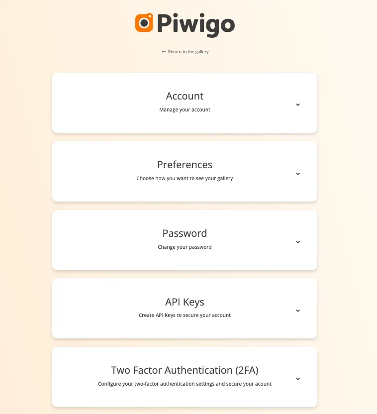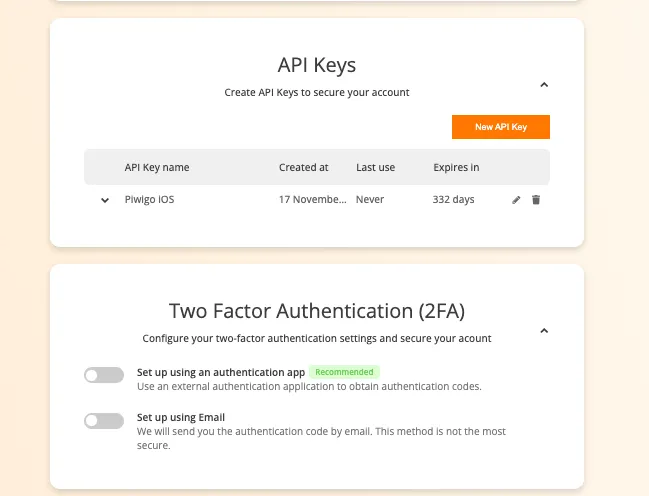 - When 2FA is enabled, third-party applications will no longer be able to connect using just a username and password. If a user enables 2FA and wants to continue using the Piwigo mobile app, Piwigo Remote Sync, or the Lightroom export plugin, they will need to create an API key. Full details are available in the documentation.