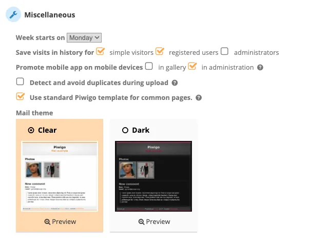 If you prefer to keep your theme’s original design for these pages, simply go to Administration > Configuration > Options and uncheck “Use standard Piwigo template for common pages.”