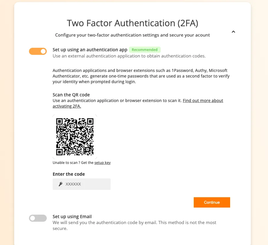 Each user can then decide, from their profile page, whether or not to enable two-factor authentication for their account.